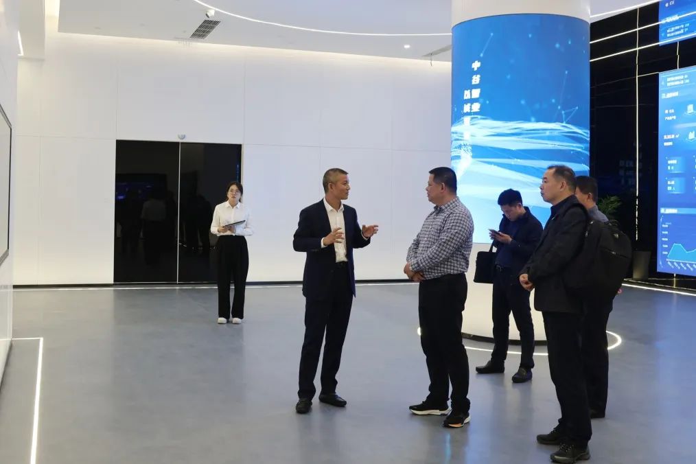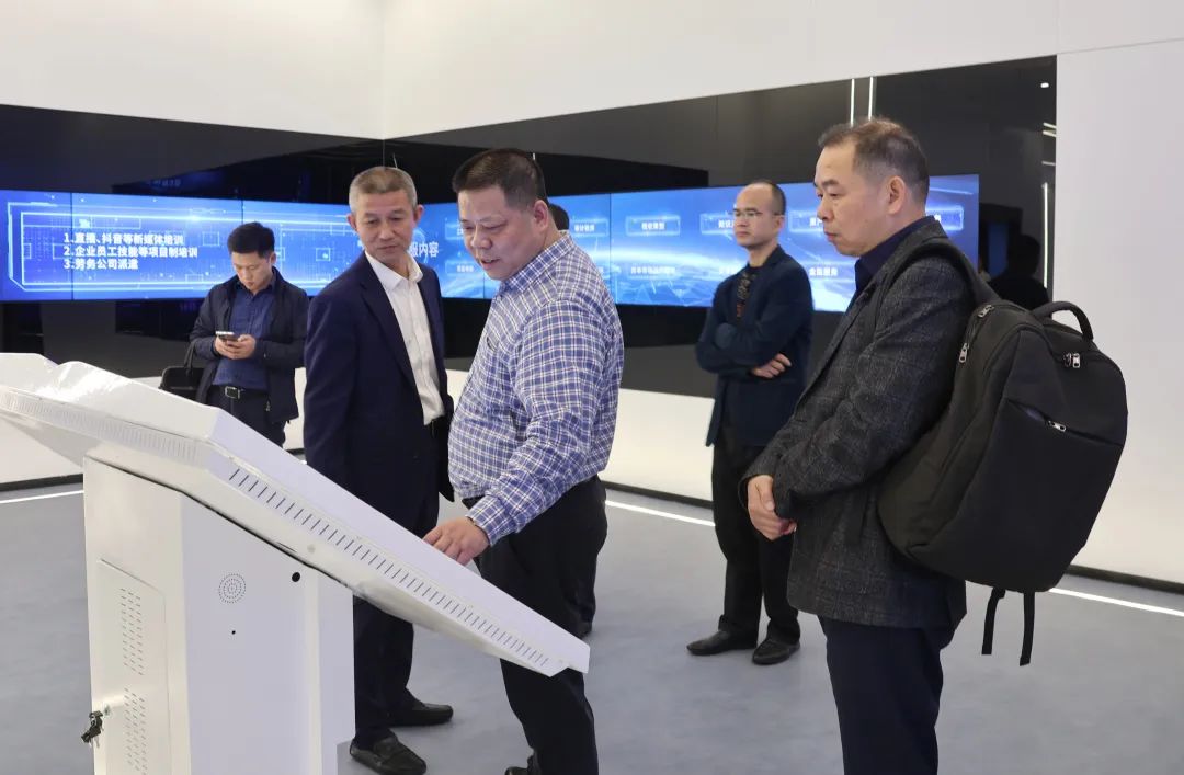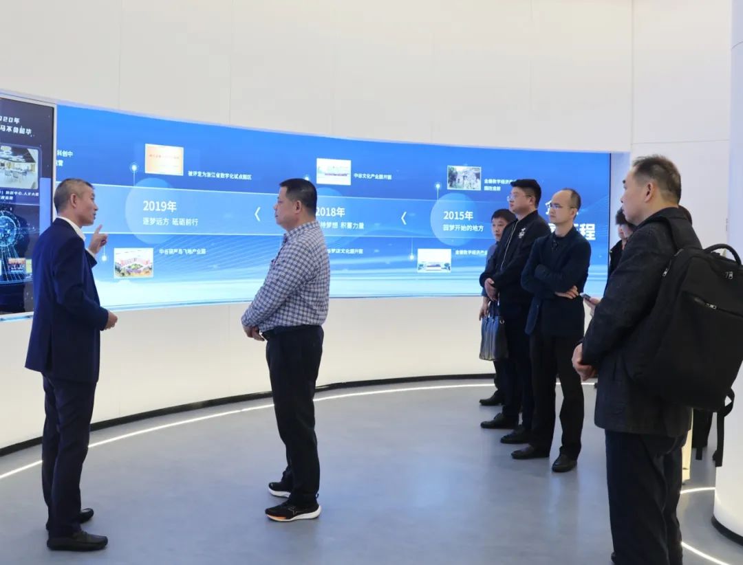 在公司自主设计、研发、建设的全球首个全数字化共享展厅里,徐军山向考察组详细介绍了公司助力金磐数字经济园、各类成熟园区和政企合作项目进行数字化建设、实现智能化增效的主要情况。